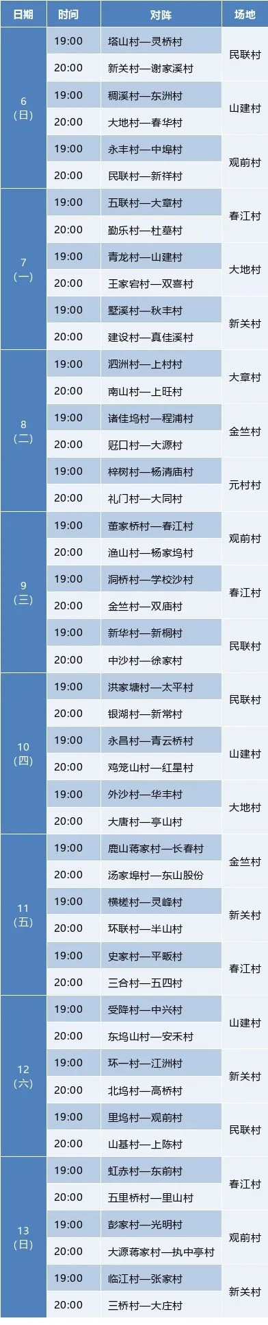 La compétition a eu lieu dans neuf zones de compétition: Le village de Minlian à Dongzhou sous-district; Le village de Dadi, le village de Jinzhu et le village de Guanqian (Zhougongwu) dans le sous-district de Yinhu; Village de Chunjiang et village de Shanjian dans le sous-district de Chunjiang; Le village de Yuan dans la ville de Xindeng; la salle de basket-ball de la ville de Changlv; et le village de Xinguan dans la ville de Dayuan . Cette année, encore plus de gens pourront regarder les matchs passionnants à leur porte.